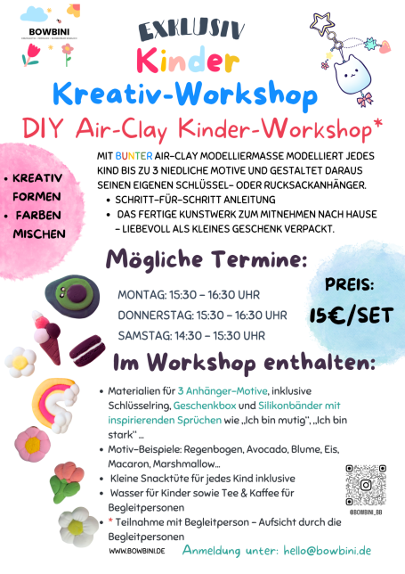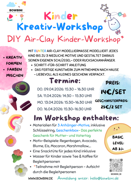 Im April wird es bei BOWBINI in Böblingen (bei Stuttgart) besonders kreativ. In unseren Kinder Kreativ-Workshops gestalten Kinder mit viel Freude ihre eigenen kleinen Kunstwerke. Von niedlichen Schlüsselanhängern aus Air-Clay Modelliermasse bis hin zu liebevollen DIY-Geschenken für Mama und Papa – jedes Kind kann seiner Fantasie freien Lauf lassen.