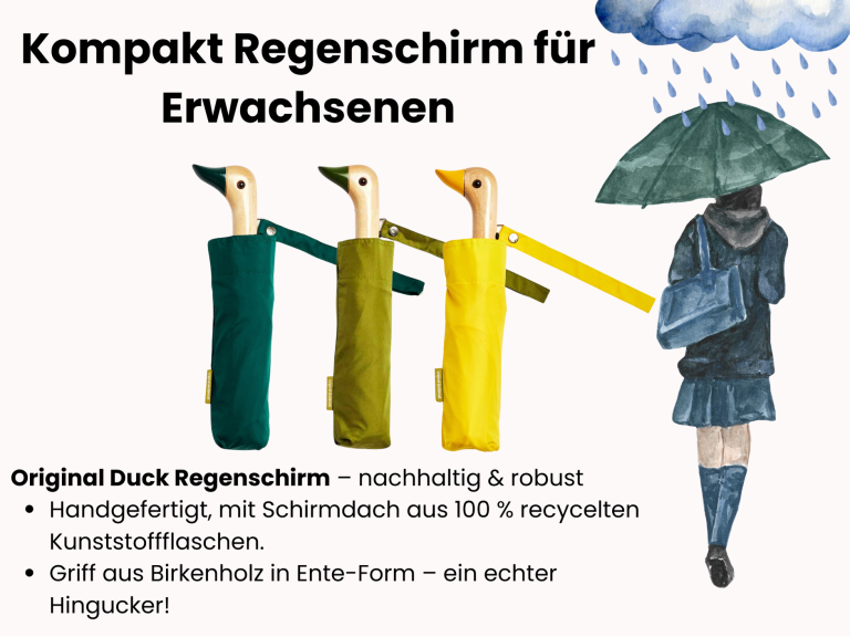 Bunt, praktisch, langlebig und umweltbewusst – der Duck Regenschirm vereint Stil, Funktionalität und Nachhaltigkeit in einem einzigartigen Accessoire.